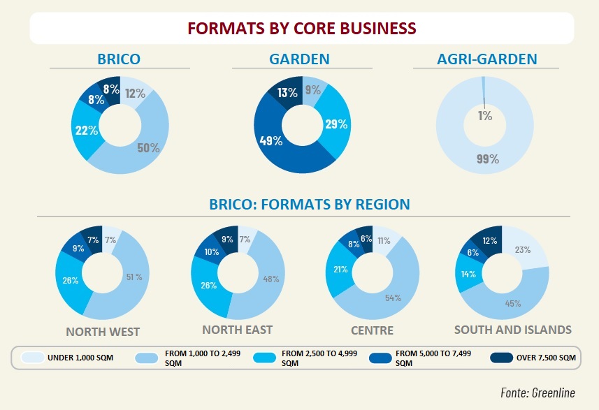 Looking more closely at DIY centers, which are the most numerous in terms of volume, we find that small-scale stores (under 1,000 sqm) are more prevalent in the southern regions: they represent 23% of all DIY centers in that macro-area.