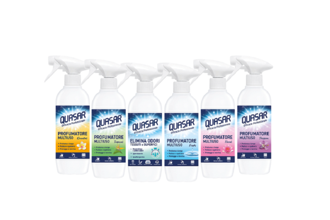 From Quasar’s professional experience comes an innovative product line consisting of five Multi-purpose Fragrances, ideal for scenting and cleaning household surfaces, available in Fresh, Tropical, Floral, Passion, and Oriental fragrances.