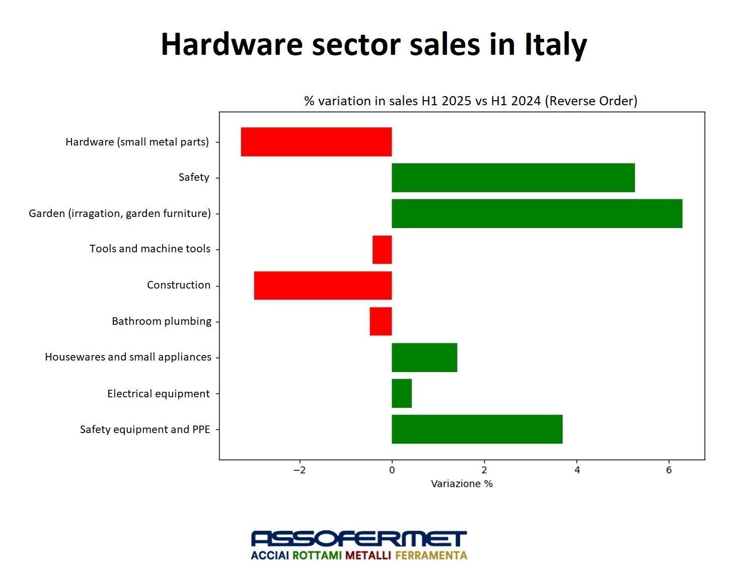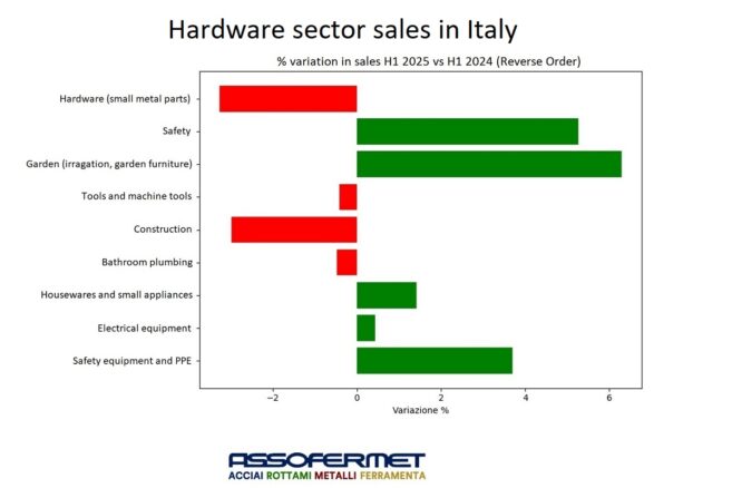 Assofermet analyzed sales trends in the Hardware Sector in the first half of 2025, compared to the same period in 2024, broken down by product category.