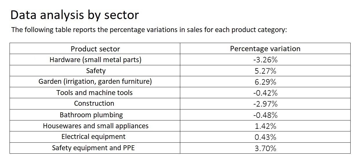 Conversely, the garden (+6.29%) and safety (+5.27%) sectors show significant growth, driven by the increase in DIY activities and greater attention to security.