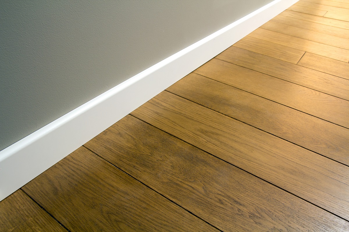 Close up of white plastic plinths on dark wooden oak floor parquet.